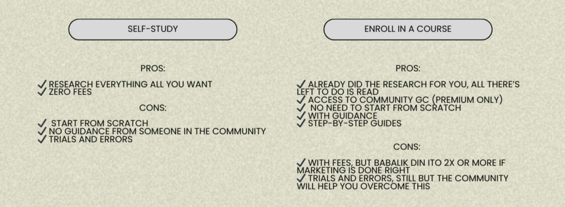 Scrolling through my TikTok FYP, I often see digital product sellers sharing their impressive earnings. At first, I was skeptical about how they could make 5-6 digits a month— far more than the average salary in the Philippines.So what I did was, I did my research. To my surprise, I realized I had already been into the digital product world back when I was in BNS, creating custom binder covers for commissions.Fast forward, I joined someone's TikTok live where they explained how this community works. A few days later, I finally gave in and took the risk. Since I was just starting and it was my finals season —no time to make my own products from scratch pa talaga, so, I decided to buy ready-made digital products kasi I WANT TO SELL AND EARN AGAD.I ENROLLED TO A COURSE. Nag labas ako ng pera, in short. I TRUSTED MYSELF THAT I COULD GET A RETURN OF INVESTMENT SOON.At first mahirap, hindi ako naging consistent. Since there were already many sellers in this community, I struggled because I didn't study the course enough especially about effective marketing. Dahil don, I studied the course again, made my own branding, and FINALLY launched it.IM STARTING TO GET MORE SALES! Even the people in our community got their sales. ALL JUST BECAUSE, WE TOOK THE RISK.All these achievements were possible because we were willing to take risks and put in the hard work and effort.